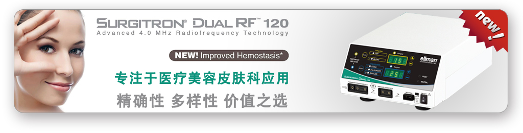 美國ellman公司全新設計的產品SURGITRON DUAL RF 120IEC機型,提供了優越的射頻止血功能,而且是同時擁有4.0Mhz和 1.7Mhz的雙射頻產品!