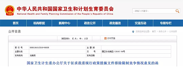 不久前,國家衛(wèi)計(jì)委發(fā)布《國家衛(wèi)生計(jì)生委辦公廳關(guān)于征求我委現(xiàn)行政策措施文件排除限制競爭情況意見的函》(以下簡稱《函》)。