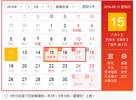 2016年北京華康普美科技有限公司“中秋節”假期為:9月15日(星期四)、9月16日(星期五)、9月17日(星期六)共放假3天,9月18日(星期日)正常上班。中秋節假期安排見下圖: