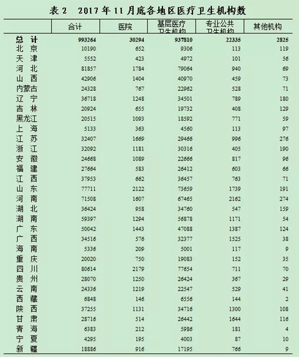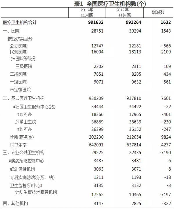 截至2017年11月底,全國醫療衛生機構數達99.3萬個。與2016年11月底比較,全國醫療衛生機構增加1632個,其中:醫院增加1543個,基層醫療衛生機構增加7601個,專業公共衛生機構減少7190個。