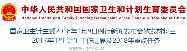 1月9日,國家衛計委召開例行新聞發布會。隨后官網公布了會上散發的《2017年衛生計生工作進展及2018年重點任務》材料。