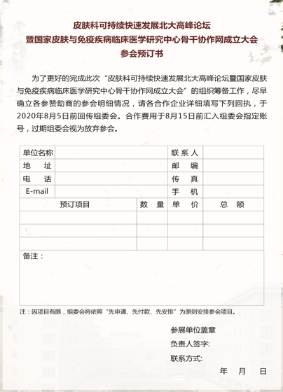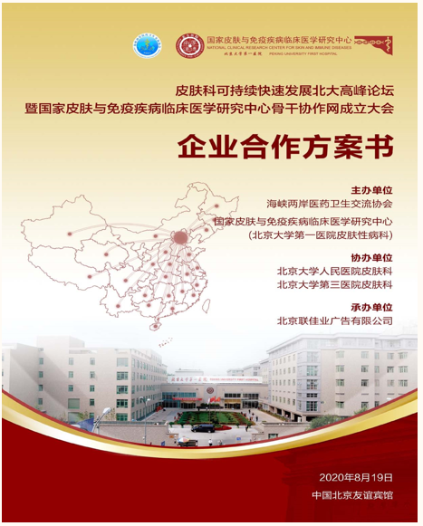 皮膚科可持續(xù)快速發(fā)展北大高峰論壇暨國家皮膚與免疫疾病臨床醫(yī)學(xué)研 究中心骨干協(xié)作網(wǎng)成立大會(huì)于2020年8月19日在京舉行,屆時(shí)將邀請(qǐng)國家科 技部、國家衛(wèi)生健康委、北京大學(xué)等各級(jí)領(lǐng)導(dǎo)與全國各知名醫(yī)院皮膚科主任 一起見證國家皮膚與免疫疾病臨床醫(yī)學(xué)研究中心全國協(xié)作網(wǎng)及工作平臺(tái)的建 立,共同探索醫(yī)療、教學(xué)、科研等多個(gè)層面如何開展交流與協(xié)作,以實(shí)現(xiàn)皮 膚學(xué)科可持續(xù)快速發(fā)展的共贏之路。同期將舉行皮膚科多場(chǎng)專業(yè)學(xué)術(shù)活動(dòng)。