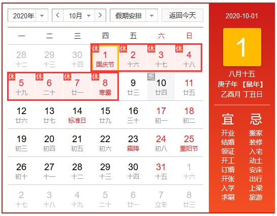 2020年北京華康普美科技有限公司,中秋節&國慶節假期為:10月1日-10月8日放假調休,共8天,9月27日(星期日)、10月10日(星期六)上班。