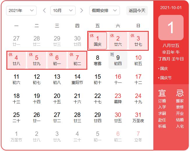 根據(jù)《國(guó)務(wù)院辦公廳關(guān)于2021年部分節(jié)假日安排的通知》,現(xiàn)將公司2021年國(guó)慶節(jié)放假的相關(guān)事宜通知如下:2021年北京華康普美科技有限公司,國(guó)慶節(jié)假期為:10月1日至7日放假調(diào)休,共7天。9月26日(星期日)、10月9日(星期六)上班。