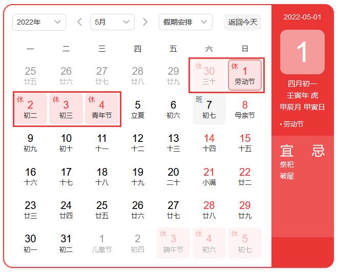 2022年北京華康普美科技有限公司,“五一勞動節”假期為:4月30日至5月4日放假調休,共5天。4月24日(星期日)、5月7日(星期六)上班。