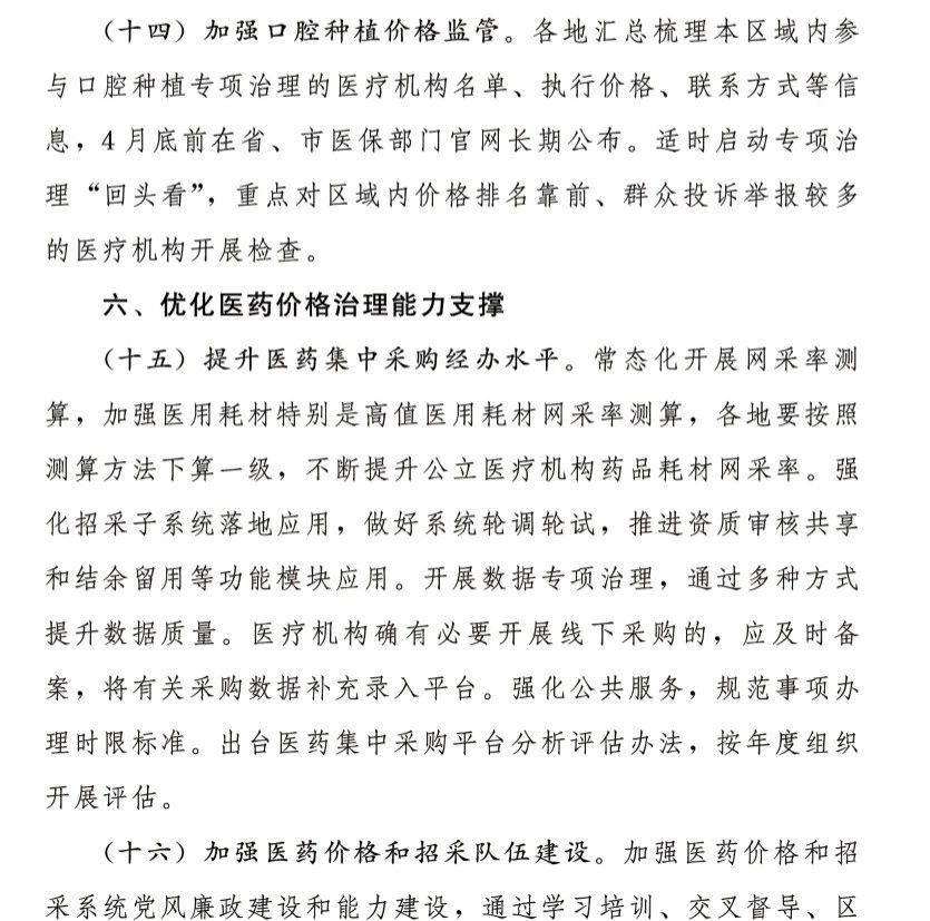 另一方面要加強口腔種植價格監管。各地匯總梳理本區域內參與口腔種植專項治理的醫療機構名單、執行價格、聯系方式等信息,4月底前在省、市醫保部門官網長期公布。適時啟動專項治理“回頭看”,重點對區域內價格排名靠前、群眾投訴舉報較多的醫療機構開展檢查。