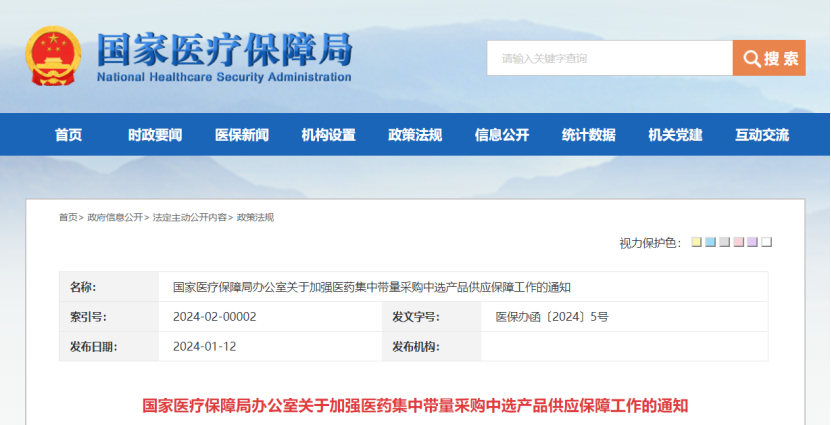 1月12日,國家醫保局發布《國家醫療保障局辦公室關于加強醫藥集中帶量采購中選產品供應保障工作的通知》(以下簡稱《通知》),要求進一步做好中選藥品和醫用耗材供應保障工作。