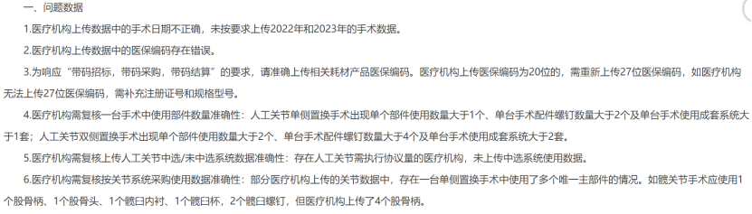 1月12日,四川省醫保局發布《川藥招〔2024〕9號 關于開展人工關節類醫用耗材整改情況“回頭看”工作醫療機構問題數據處理的通知》。其中指出,根據《關于開展人工關節類醫用耗材整改情況“回頭看”工作的通知》相關要求,國家聯采辦梳理了截至目前醫療機構上傳數據中的問題,請各單位督促醫療機構及時修改問題數據并重新上傳。