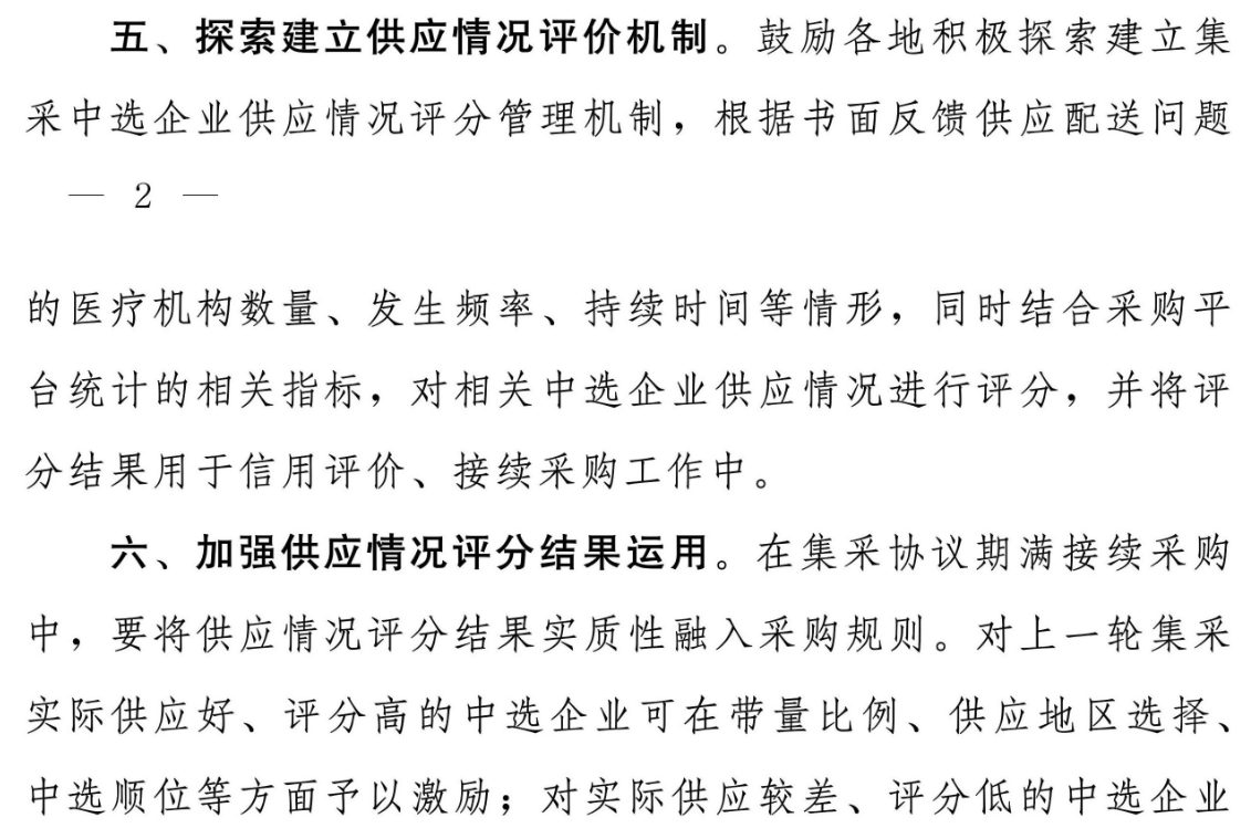 加強供應情況評分結果運用。在集采協議期滿接續采購中,要將供應情況評分結果實質性融入采購規則。對上一輪集采實際供應好、評分高的中選企業可在帶量比例、供應地區選擇中選順位等方面予以激勵;對實際供應較差、評分低的中選企業應采取一定制約,直至取消其申報資格。