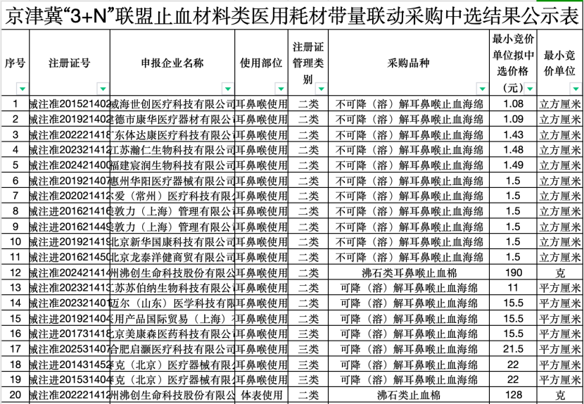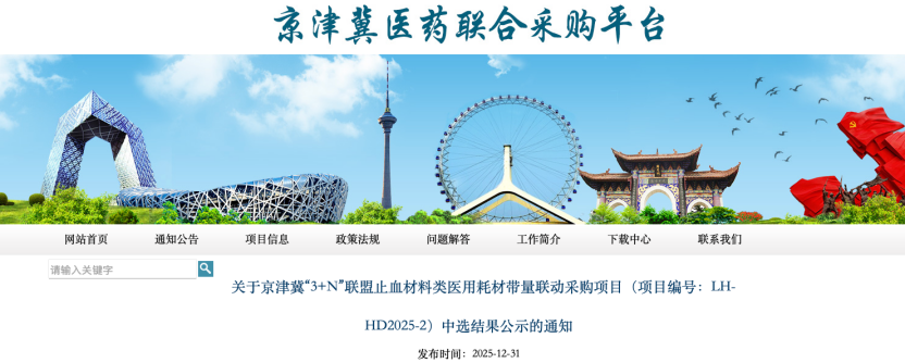12月31日,天津市醫藥采購中心發布《關于京津冀“3+N”聯盟止血材料類醫用耗材帶量聯動采購項目(項目編號:LH-HD2025-2)中選結果公示的通知》,公示時間為2025年12月31日—2026年1月5日17時。