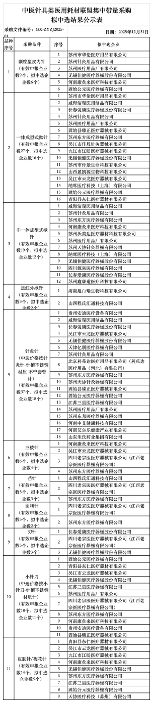 12月31日,廣西醫保局發布了《關于公示中醫針具類醫用耗材聯盟集中帶量采購擬中選結果的通知》,公示時間為2025年12月31日至2026年1月7日。