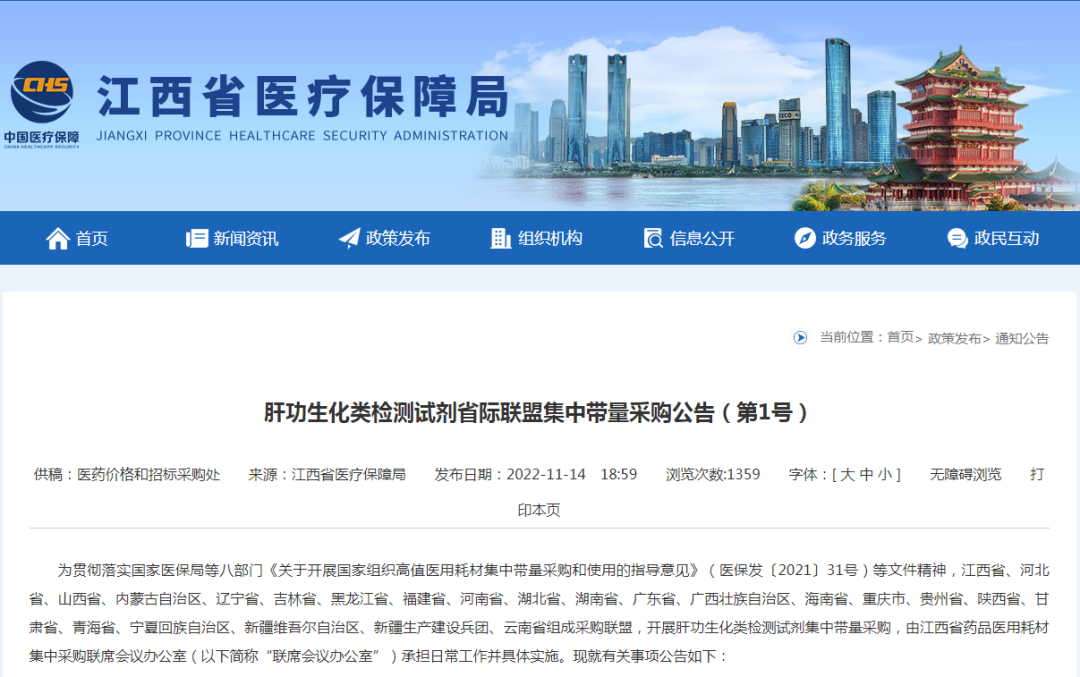 繼征集意見稿后,江西省醫(yī)療保障局近日發(fā)布了《肝功生化類檢測試劑省際聯(lián)盟集中帶量采購公告(第1號)》