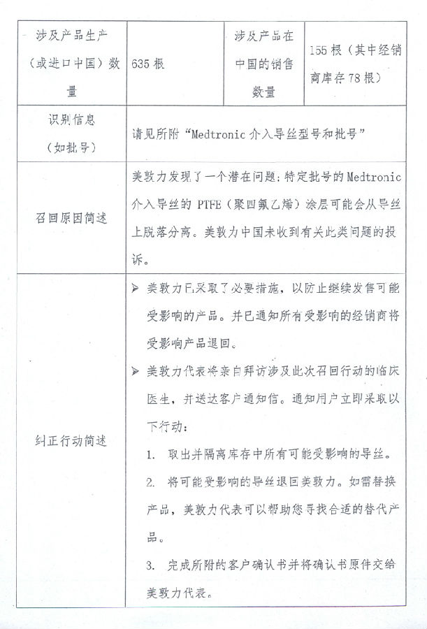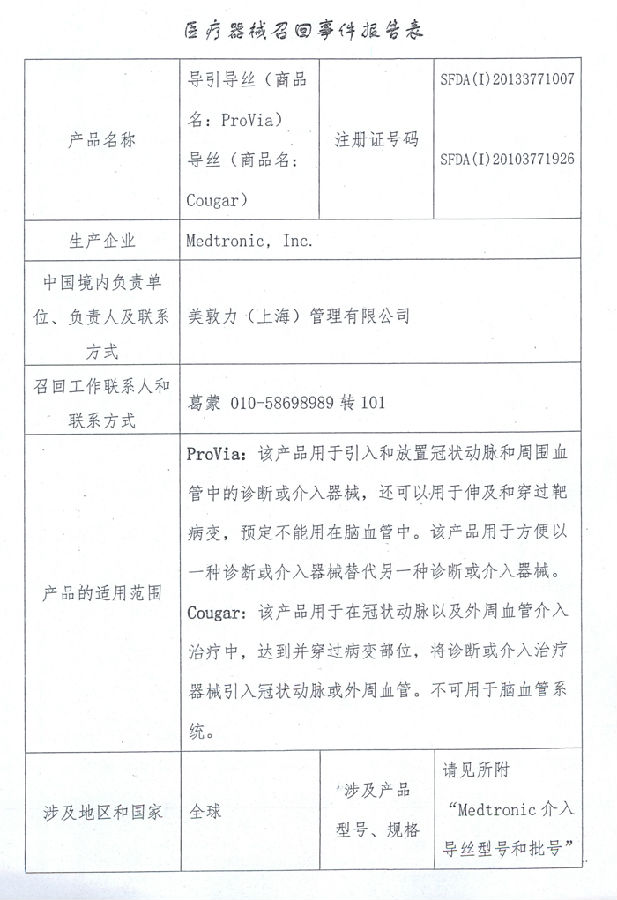 根據2013年12月2日上海市食品藥品監督管理局的報告,由于PTFE(聚四氟乙烯)涂層可能會從導絲上脫落分離等原因,Medtronic,Inc.公司對其生產的導引導絲(注冊號:國食藥監械(進)字2013第3771007號)、導絲(注冊號:國食藥監械(進)字2010第3771926號)進行主動召回。請各省、自治區、直轄市食品藥品監督管理局加強對此類產品的監督管理。