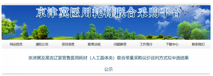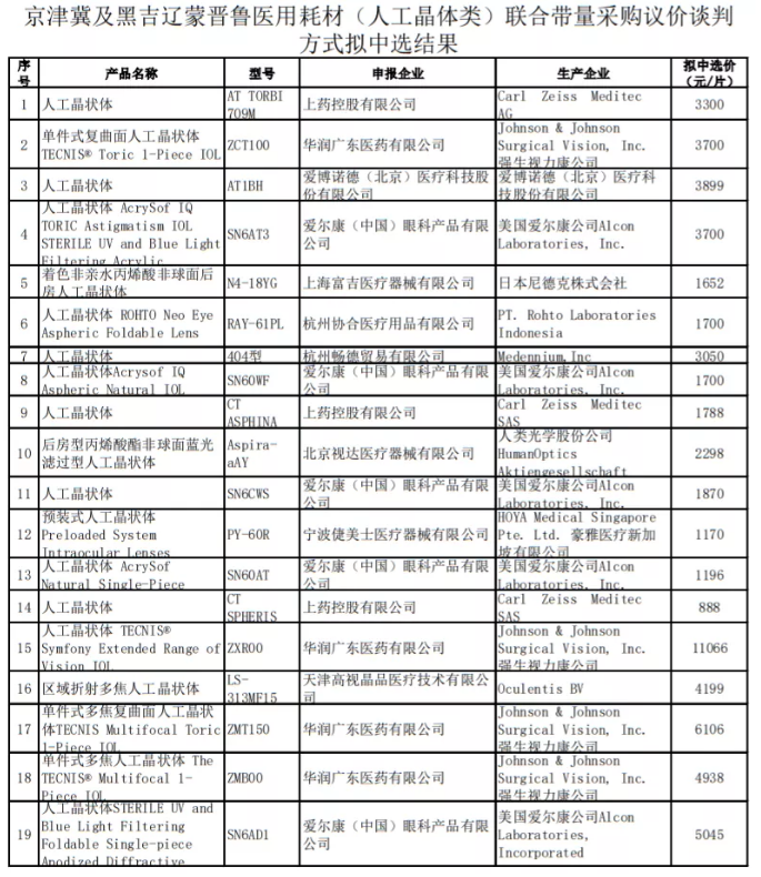 5月18日,京津冀醫用耗材聯合采購平臺發布《京津冀及黑吉遼蒙晉魯醫用耗材(人工晶體類)聯合帶量采購議價談判方式擬中選結果公示》,公布3+6耗材談判中標械企及價格。