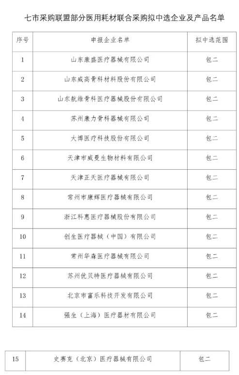 事實上,早在11月初,七市聯(lián)盟就已發(fā)布公告表示,將對骨科創(chuàng)傷類(普通接骨板及配套螺釘<國產(chǎn)/進(jìn)口>、鎖定接骨板及配套螺釘<國產(chǎn)/進(jìn)口>、髓內(nèi)釘系統(tǒng)及附件<國產(chǎn)/進(jìn)口>),血液透析類(血液過濾器、血液透析器、一次性使用透析護(hù)理包、血液透析濃縮液、一次性透析用血液回路管)兩類醫(yī)用耗材,以不低于年采購量70%的約定采購量以量換價。