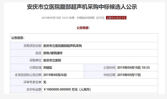 同是今天(9月18日),中國政府采購網發布《安慶市立醫院腹部超聲機采購中標候選人公示》,顯示總中標金額為188萬元。