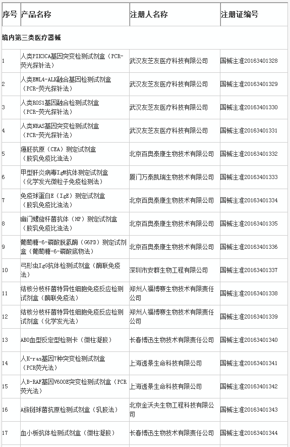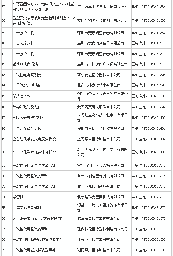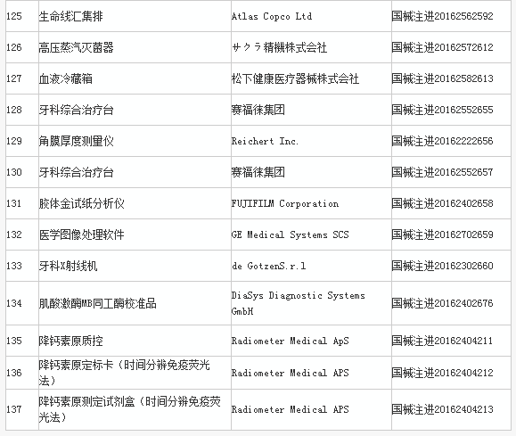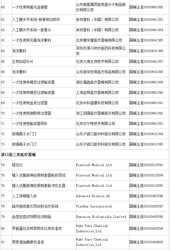 2016年8月,國家食品藥品監(jiān)督管理總局共批準(zhǔn)注冊(cè)醫(yī)療器械產(chǎn)品137個(gè)。其中,境內(nèi)第三類醫(yī)療器械產(chǎn)品73個(gè),進(jìn)口第三類醫(yī)療器械產(chǎn)品39個(gè),進(jìn)口第二類醫(yī)療器械產(chǎn)品25個(gè)。(具體產(chǎn)品見附件)。