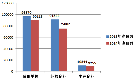 2015年,注冊基層用戶(包括醫療器械生產企業、經營企業和使用單位)總數比2014年增長了13.9%。其中,醫療器械生產企業、經營企業和使用單位的注冊基層用戶分別比2014年增長了11.8%、21.8%和7.5%(圖1-5)。
