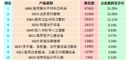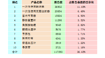 表2-2 報告數量排名前十位的無源醫療器械