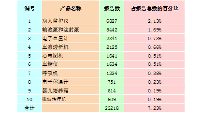 表2-3 報告數量排名前十位的有源醫療器械