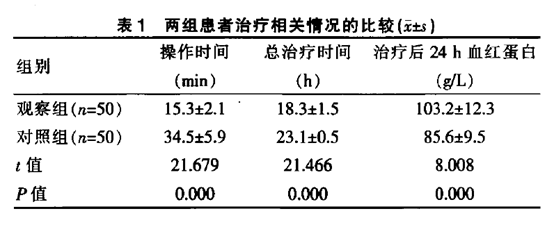 觀察組的操作時間、總治療時間均短于對照組,治療后24h血紅蛋白高于對照組,差異有統(tǒng)計學意義(P<0.05)(表1)。