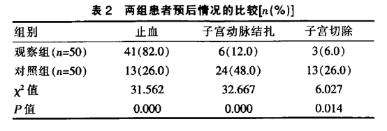 觀察組的止血率高于對照組,子宮動脈結(jié)扎率和子宮切除率低于對照組,差異有統(tǒng)計學意義(P<0.05)(表2)。