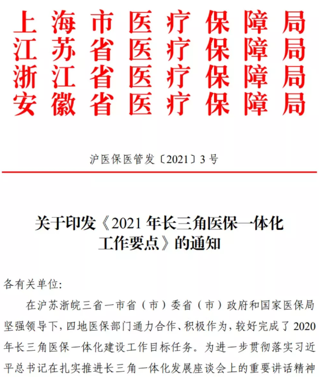 醫藥網3月17日訊 近日,一份名為《2021年長三角醫保一體化工作要點》的通知在業內流傳。文件顯示由上海、江蘇、浙江、安徽三省一市的醫保局聯合發布。