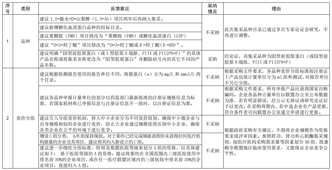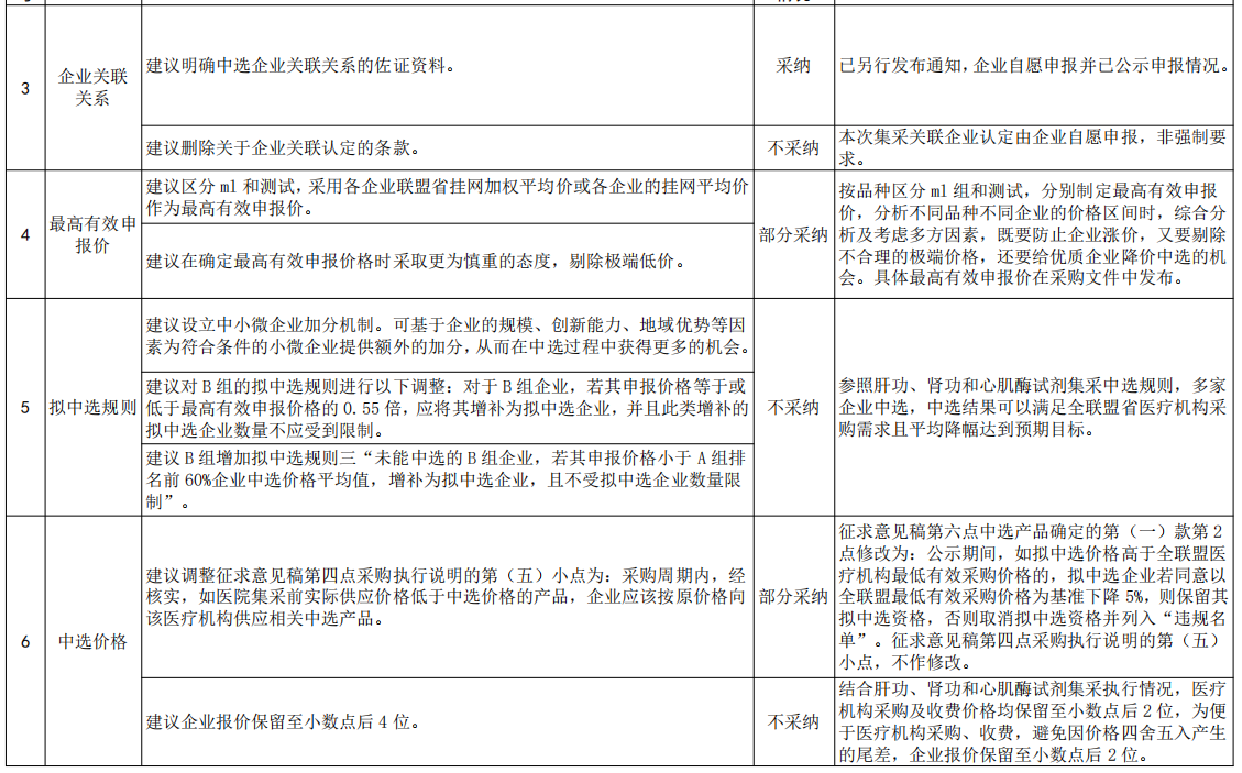 同時(shí),在擬中選規(guī)則中“設(shè)立中小微企業(yè)加分機(jī)制”“B組低價(jià)增補(bǔ)”等建議也均被駁回,官方回應(yīng)的理由為:參照肝功、腎功和心肌酶試劑集采中選規(guī)則,多家企業(yè)中選,中選結(jié)果可以滿足全聯(lián)盟省醫(yī)療機(jī)構(gòu)采購需求且平均降幅達(dá)到預(yù)期目標(biāo)。