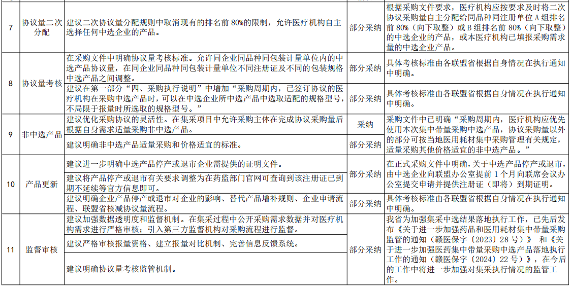 但也有多條意見未被采納,例如在競價(jià)分組階段“將大中小企業(yè)分為不同競價(jià)組別”“根據(jù)醫(yī)院等級(jí)來劃分A組資格””增設(shè)C組分類“等。對(duì)此官方明確表示,根據(jù)政府采購有關(guān)規(guī)定,不得將企業(yè)規(guī)模作為資格要求或評(píng)審因素。按醫(yī)療機(jī)構(gòu)采購需求量等因素劃分AB組,既兼顧全聯(lián)盟地區(qū)臨床使用需求,又能保證企業(yè)競爭公平性。