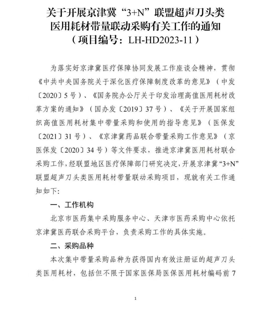 9月18日,北京醫保局發布《關于開展京津冀“3+N”聯盟超聲刀頭類醫用耗材歷史采購數據及采購需求量填報工作的通知》(簡稱《通知》)。