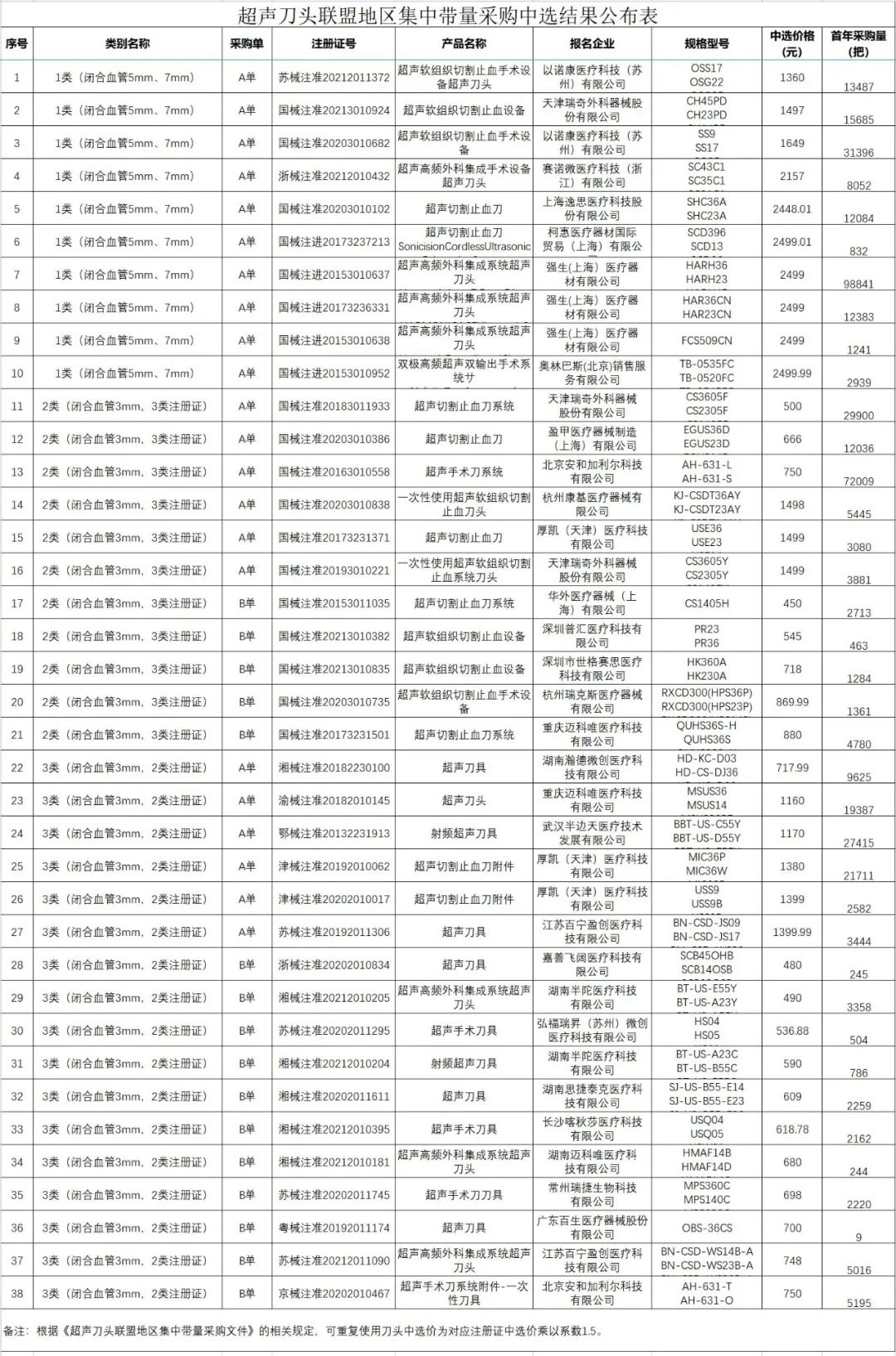 近日,深圳市公共資源交易中心發布《關于公布超聲刀頭及預充式導管沖洗器集中帶量采購中選結果的公告》,其中公布了各企業所有中選產品的中選價格和首年采購量(文末附表單)。