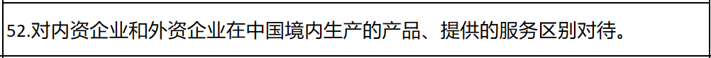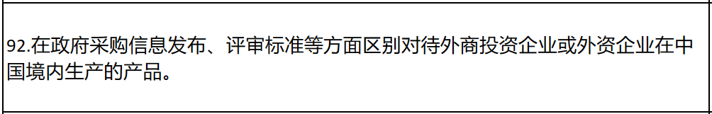 其中,“對內資企業(yè)和外資企業(yè)在中國境內生產的產品、提供的服務區(qū)別對待”“在政府采購信息發(fā)布、評審標準等方面區(qū)別對待外商投資企業(yè)或外資企業(yè)在中國境內生產的產品”“將除進口貨物以外的生產廠家授權、承諾、證明、背書等作為資格要求”等常見問題都被點名。