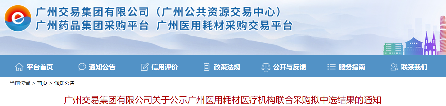 9月27日,廣東省廣州公共資源交易中心發布《關于公示廣州醫用耗材醫療機構聯合采購擬中選結果的通知》。