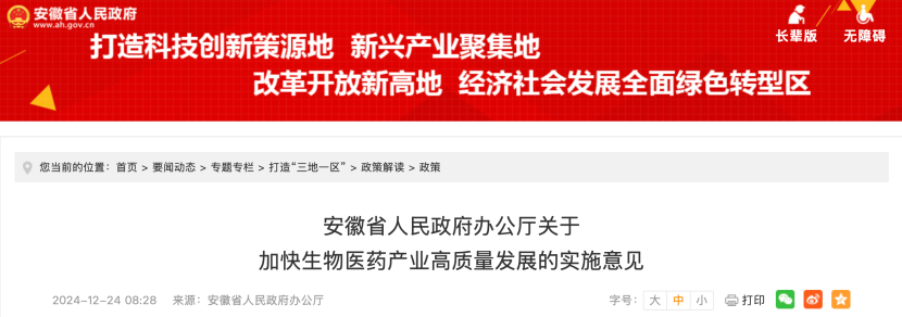 近日,安徽省人民政府辦公廳發布《安徽省人民政府辦公廳關于加快生物醫藥產業高質量發展的實施意見》。