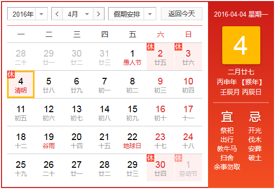 2016年北京華康普美科技有限公司,“清明節(jié)”假期為:4月2日(星期六)至4月4日(星期一)共放假3天,4月5日(星期二)正常上班。