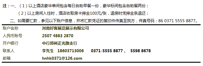4、 提供會務公司發票(開票項目:會務費)和酒店發票(開票項目:住宿費),如有需開增值稅專票,請將開票信息傳真到 0371-55558877 或者以電子郵件形式發送到訂房郵箱中。