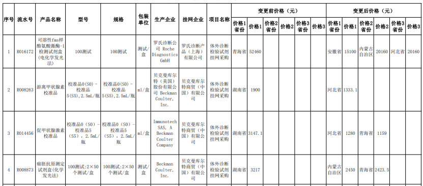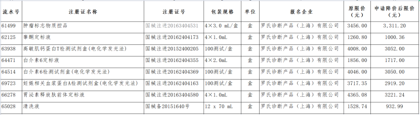 今年4月,羅氏診斷產(chǎn)品(上海)有限公司自主申請(qǐng),降低部分檢驗(yàn)試劑產(chǎn)品在安徽省的掛網(wǎng)限價(jià)。