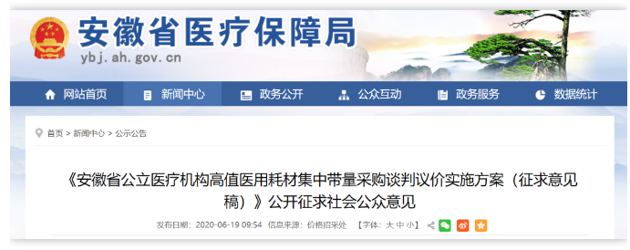 6月19日,安徽省醫保局發布《安徽省公立醫療機構高值醫用耗材集中帶量采購談判議價實施方案(征求意見稿)》(下稱《征求意見稿》)。
