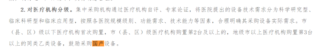 市(縣、區)級以下醫療機構首次購置,市(縣、區)級醫療機構購置第2臺及以上的,地級市以上醫療機構購置第3臺以上的同類乙類設備,鼓勵采購國產設備。