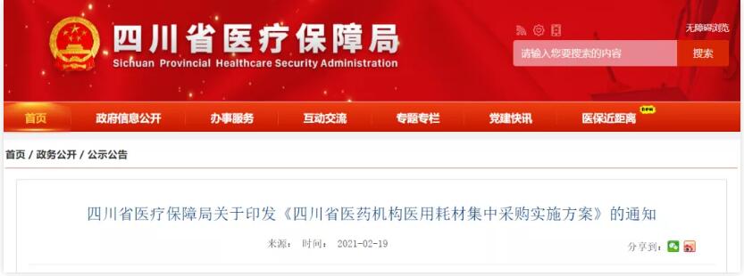2月19日,四川省醫保局發布《四川省醫藥機構醫用耗材集中采購實施方案》(下稱《實施方案》)。