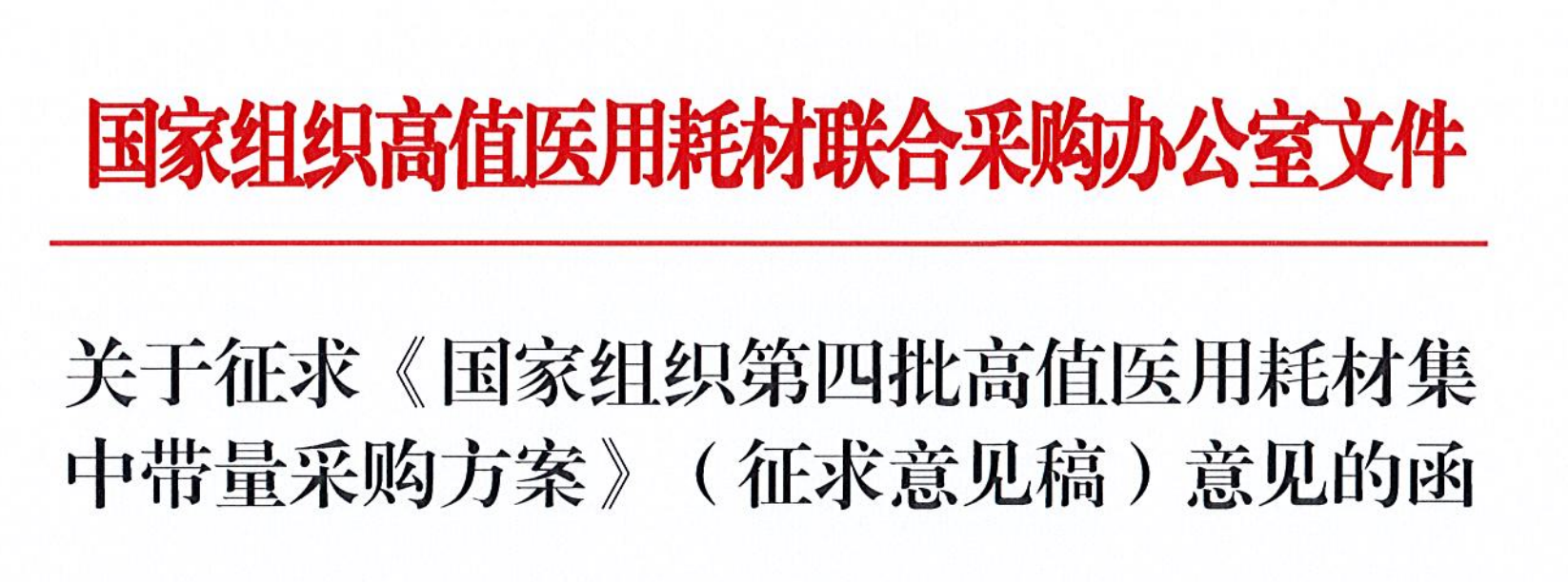 今日(7月7日),業內流傳出一份表頭為國家組織高值醫用耗材聯合采購辦公室的“關于征求《國家組織第四批高值醫用耗材集中帶量采購方案》(征求意見稿)意見的函”(以下簡稱《征求意見稿》),征求意見截止日期為7月14日12時前。