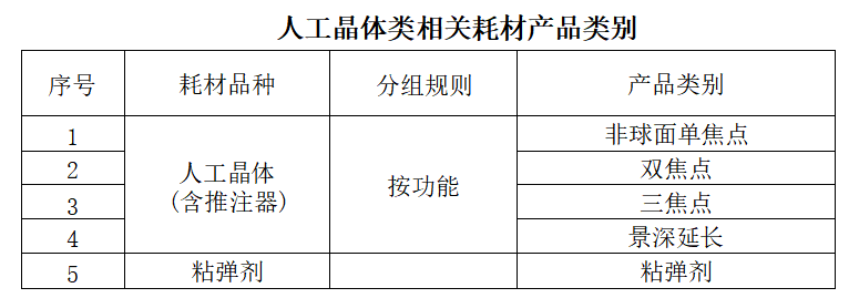 人工晶體類相關耗材包括:獲得中華人民共和國醫療器械注冊證的人工晶體耗材(不包括硬性人工晶體、有晶體眼人工晶體, 下同)、粘彈劑。人工晶體耗材須包含可與其配套使用的推注器。
