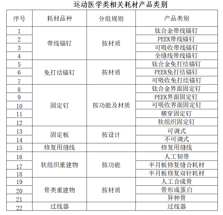 運動醫學類相關耗材包括:獲得中華人民共和國醫療器械注冊 證的帶線錨釘、免打結錨釘、界面固定釘、橫穿固定釘、軟組織 固定釘、可調式固定板、不可調式固定板、修復用縫線、人工韌 帶、半月板修復縫合耗材、半月板修復雙針耗材、人工合成骨、骨形成蛋白、異種骨、過線器。