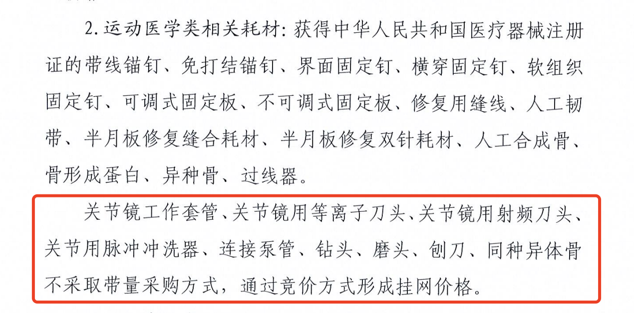 關節鏡工作套管、關節鏡用等離子刀頭、關節鏡用射頻刀頭、 關節用脈沖沖洗器、連接泵管、鉆頭、磨頭、刨刀、同種異體骨不采取帶量采購方式,通過競價方式形成掛網價格。