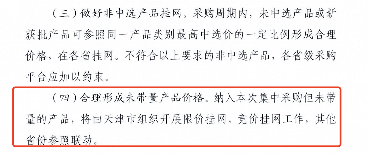 《征求意見稿》明確,合理形成未帶量產品價格。納入本次集中采購但未帶量的產品,將由天津市組織開展限價掛網、競價掛網工作,其他省份參照聯動。