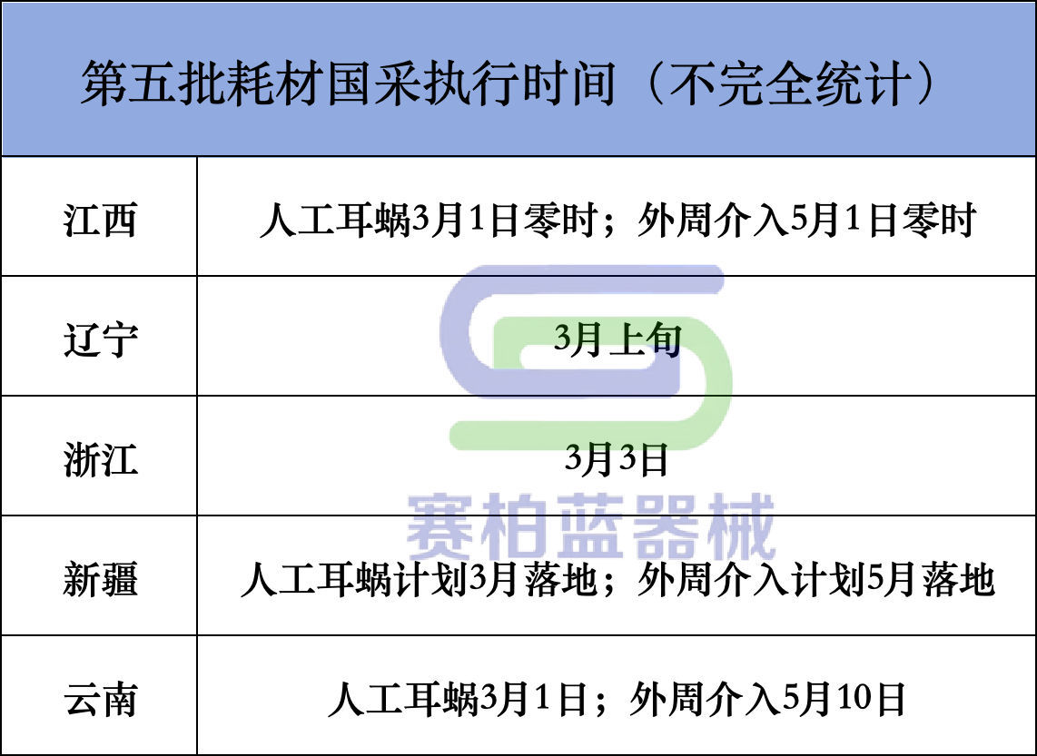 截至目前,江西、遼寧、浙江、新疆、云南等地已披露落地執行第五批耗材國采的具體時間,具體地區預計也將快速跟進。