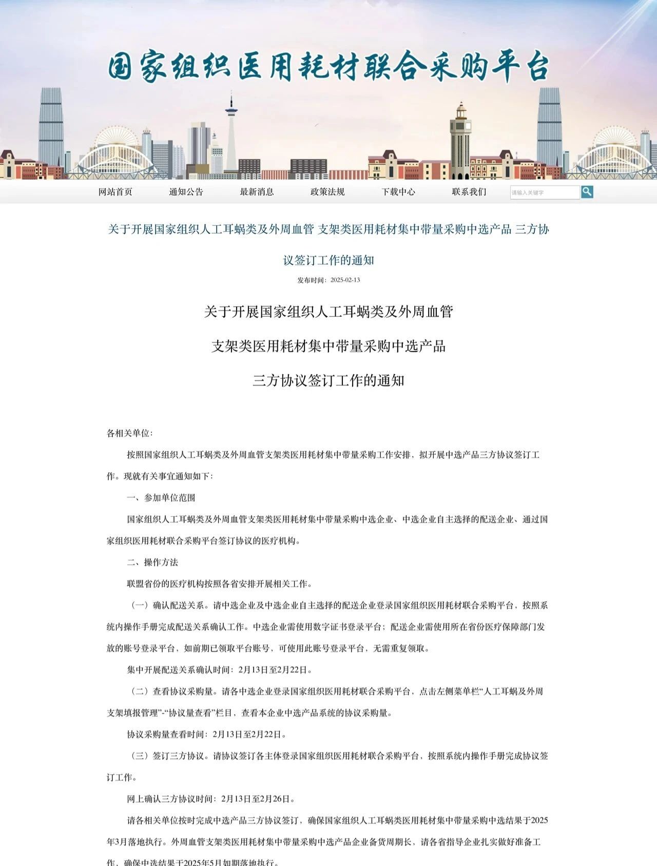 根據《通知》,第五批耗材國采集中開展配送關系確認時間為2月13日至2月22日;協議采購量查看時間為2月13日至2月22日;網上確認三方協議時間為2月13日至2月26日(詳細操作方法見文末)。