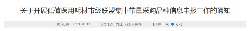 10月19日,江西九江醫(yī)保局發(fā)布《關(guān)于開展低值醫(yī)用耗材市級(jí)聯(lián)盟集中帶量采購品種信息申報(bào)工作的通知》(以下簡(jiǎn)稱《通知》),開展手術(shù)薄膜等6個(gè)品種低值醫(yī)用耗材信息申報(bào)工作。