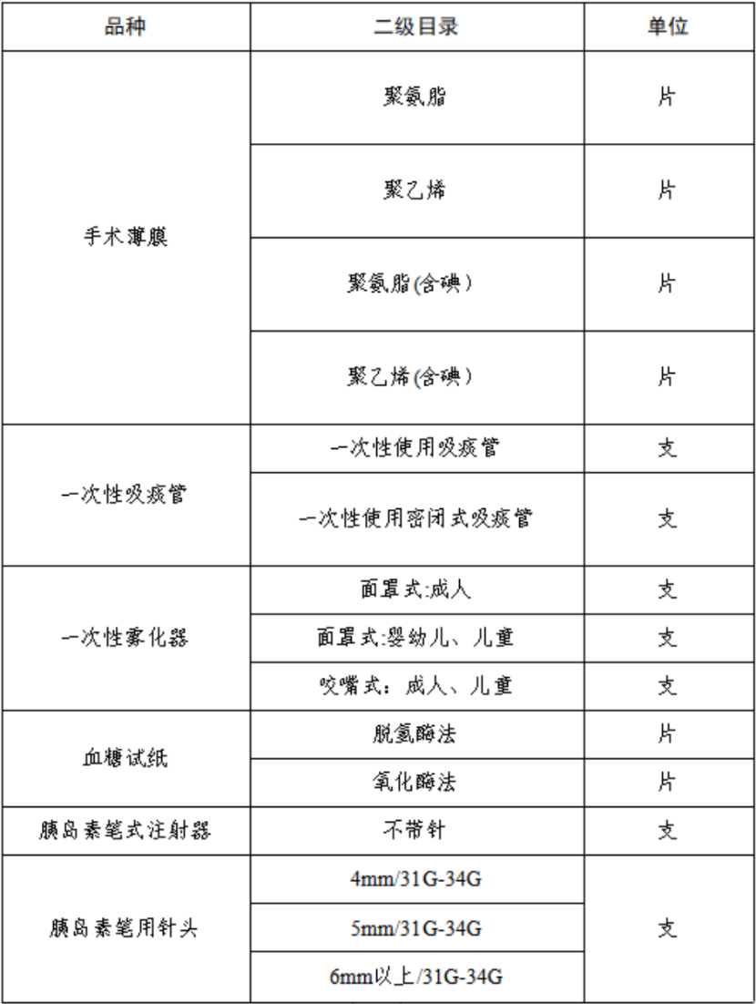 根據(jù)《通知》,此次帶量采購圍繞低值醫(yī)用耗材,具體包括手術(shù)薄膜、一次性吸痰管、一次性霧化器、血糖試紙、胰島素筆式注射器、胰島素筆用針頭。網(wǎng)上填報(bào)時(shí)間為10月19日至11月3日。
