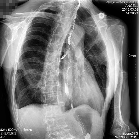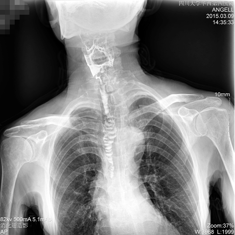 圖為斜位:通過動態(tài)影像可以清楚看到鋇劑進(jìn)入了支氣管道